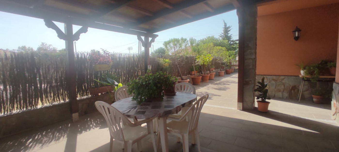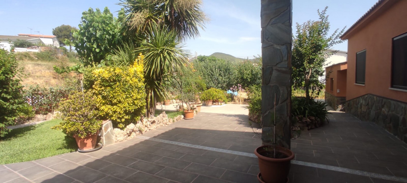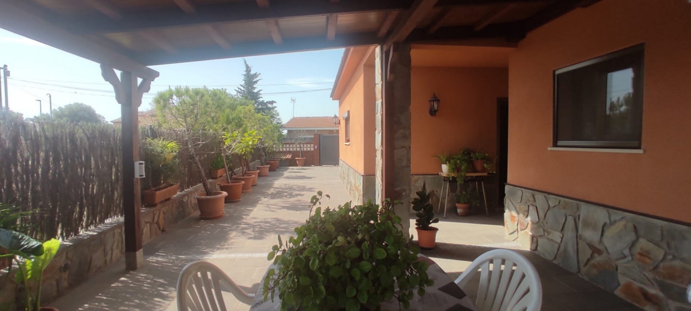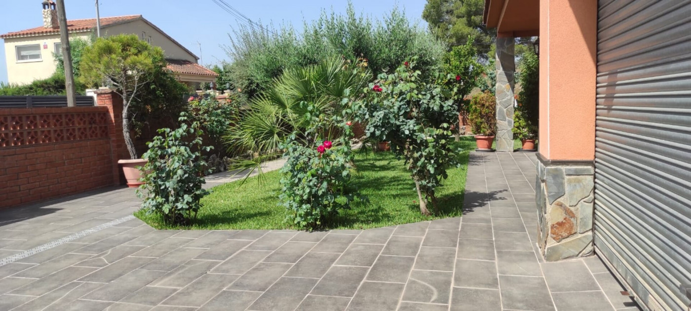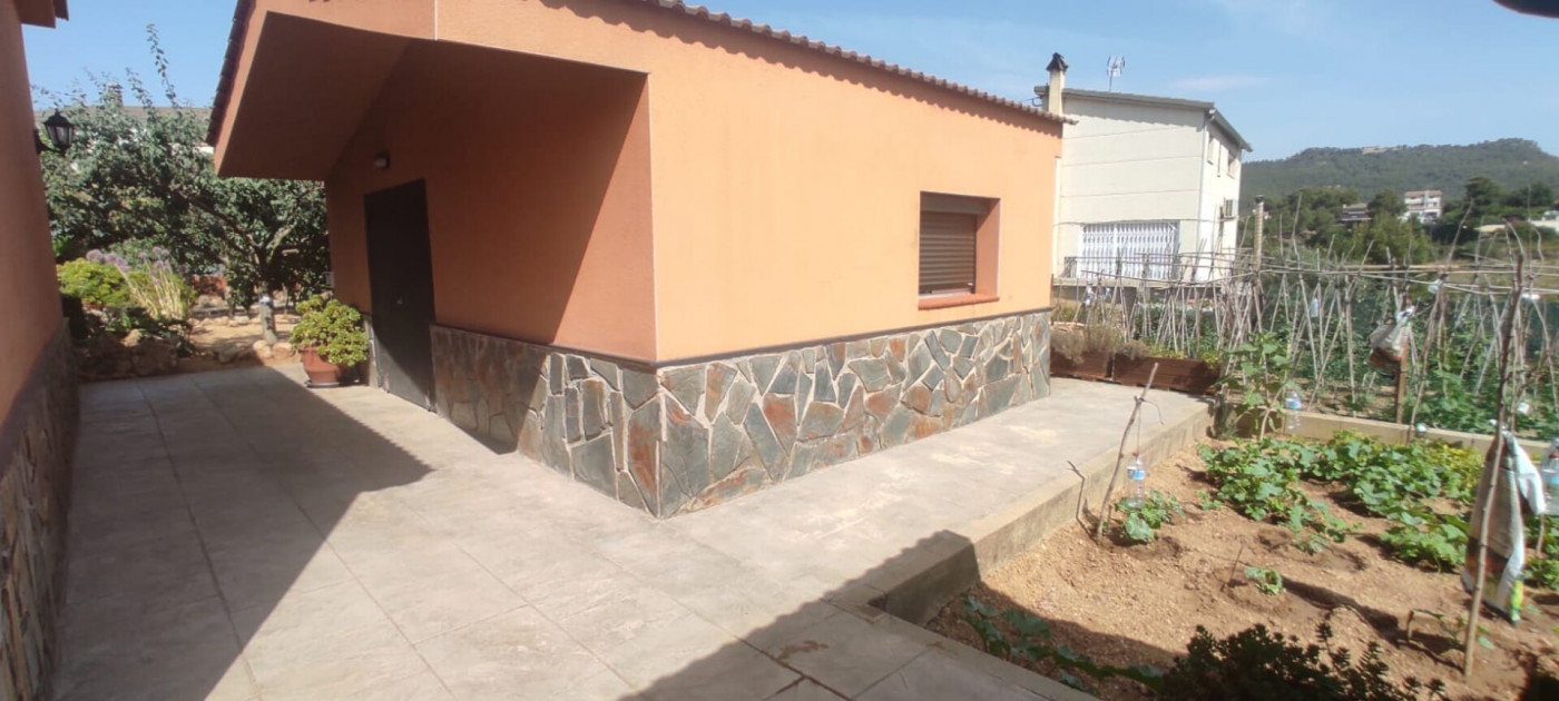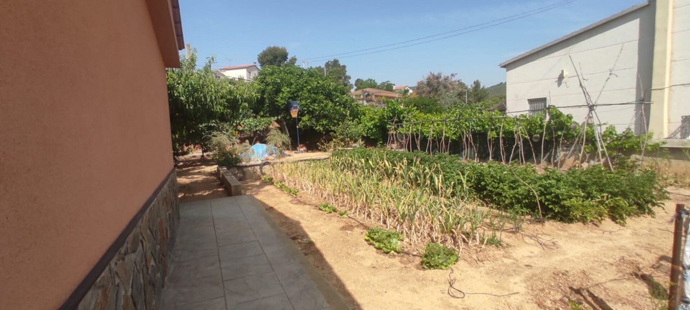 Exterior amb gran terreny de jardí al voltant de tota la casa, molt ben cuidat amb la seva zona de porxo cobert per poder fer barbacoes i gaudir tot l’any, zona d’hort on poder cultivar i petita construcció com a magatzem que es pot convertir en una altra habitació independent a la casa.