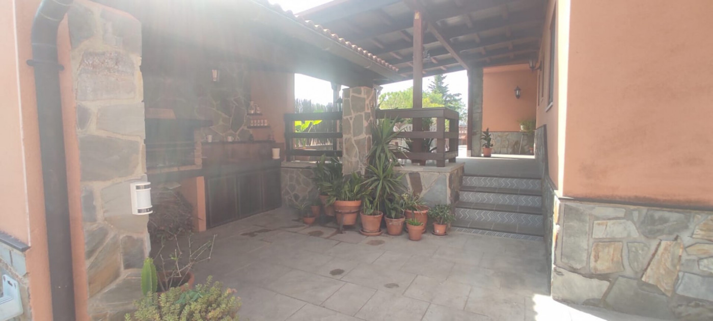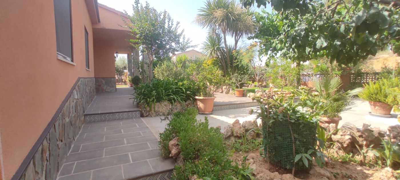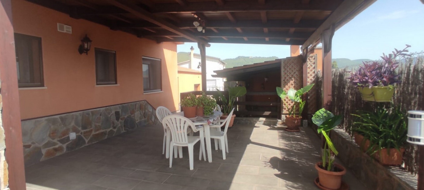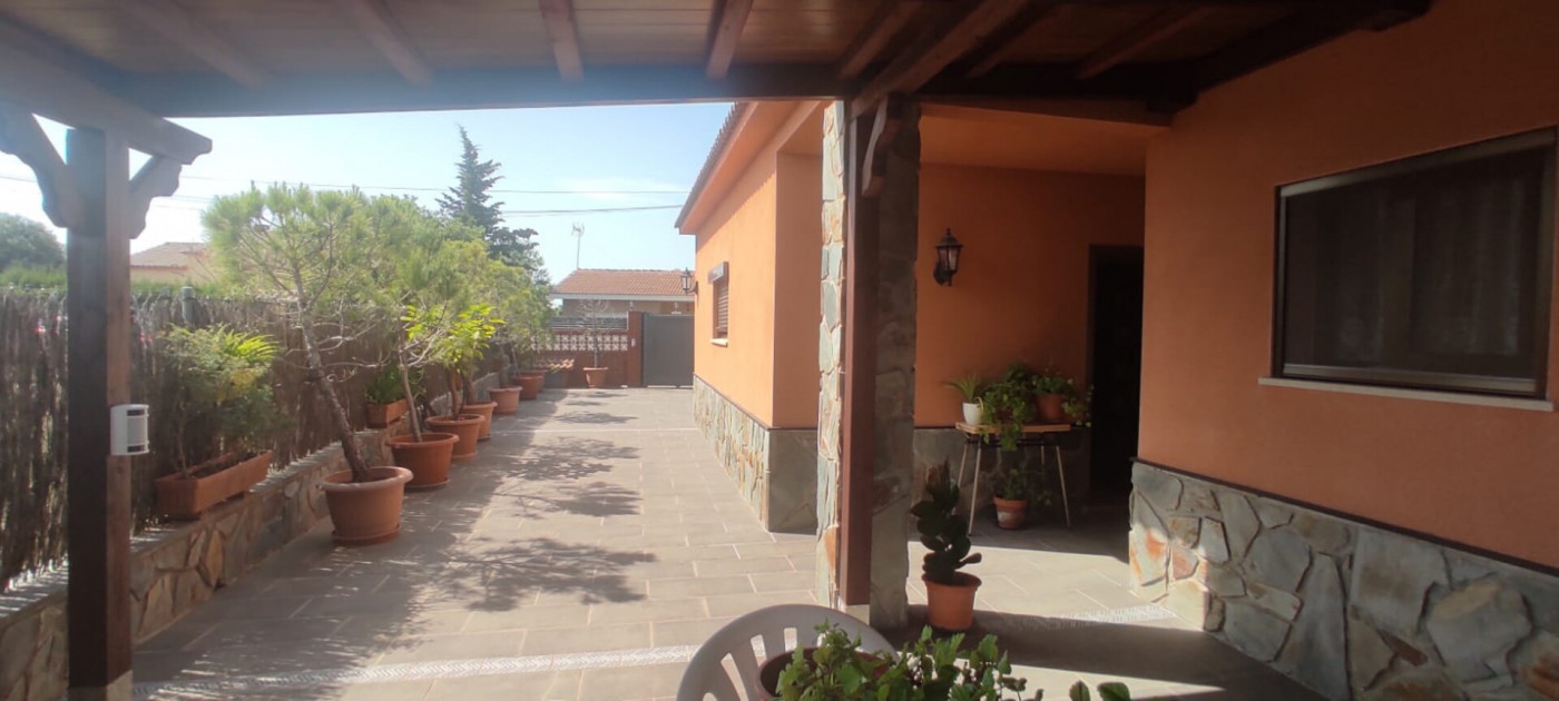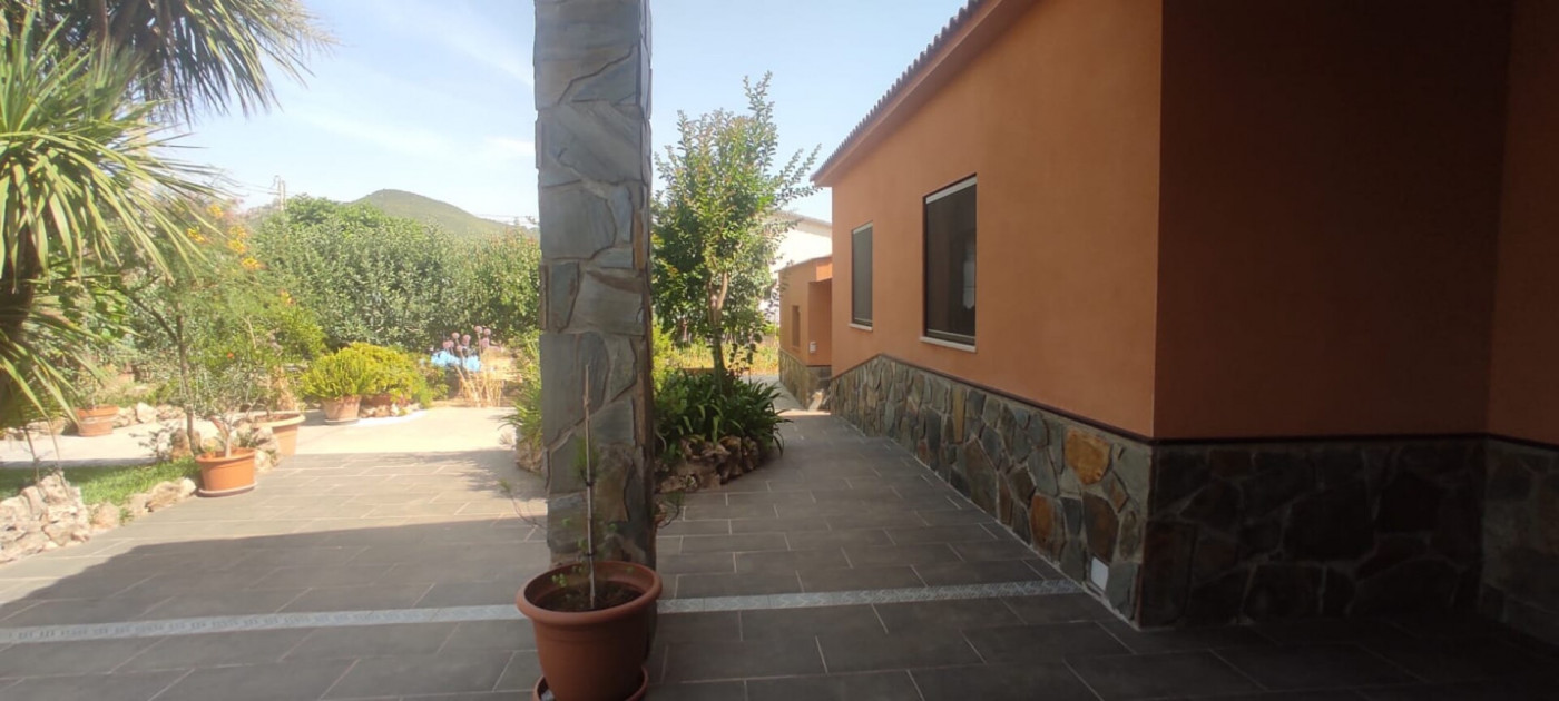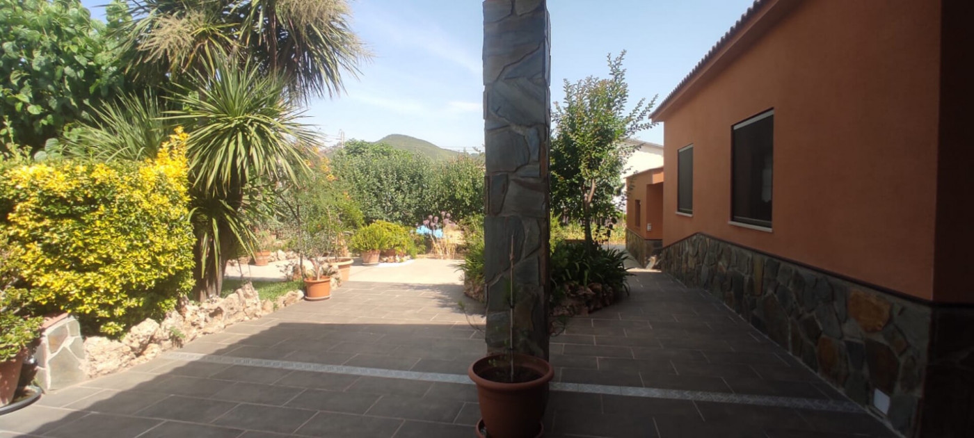 Exterior amb gran terreny de jardí al voltant de tota la casa, molt ben cuidat amb la seva zona de porxo cobert per poder fer barbacoes i gaudir tot l’any, zona d’hort on poder cultivar i petita construcció com a magatzem que es pot convertir en una altra habitació independent a la casa.