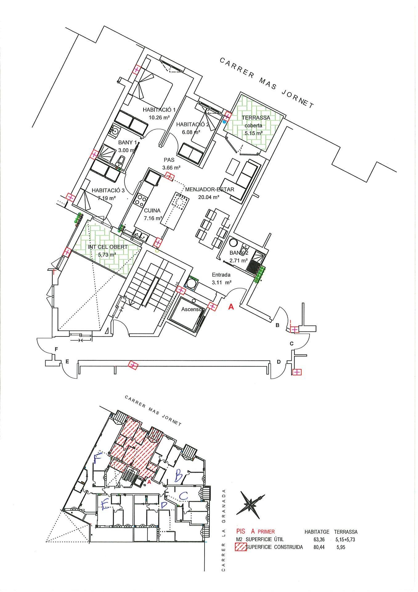 Pis amb calefacció i aire condicionat, persianes motoritzades, finestres d’ alumini amb vidre càmera i alumini amb ruptura de pont tèrmic, terres de gres porcelànic imitació fusta, mobles de cuina lacats blancs.
